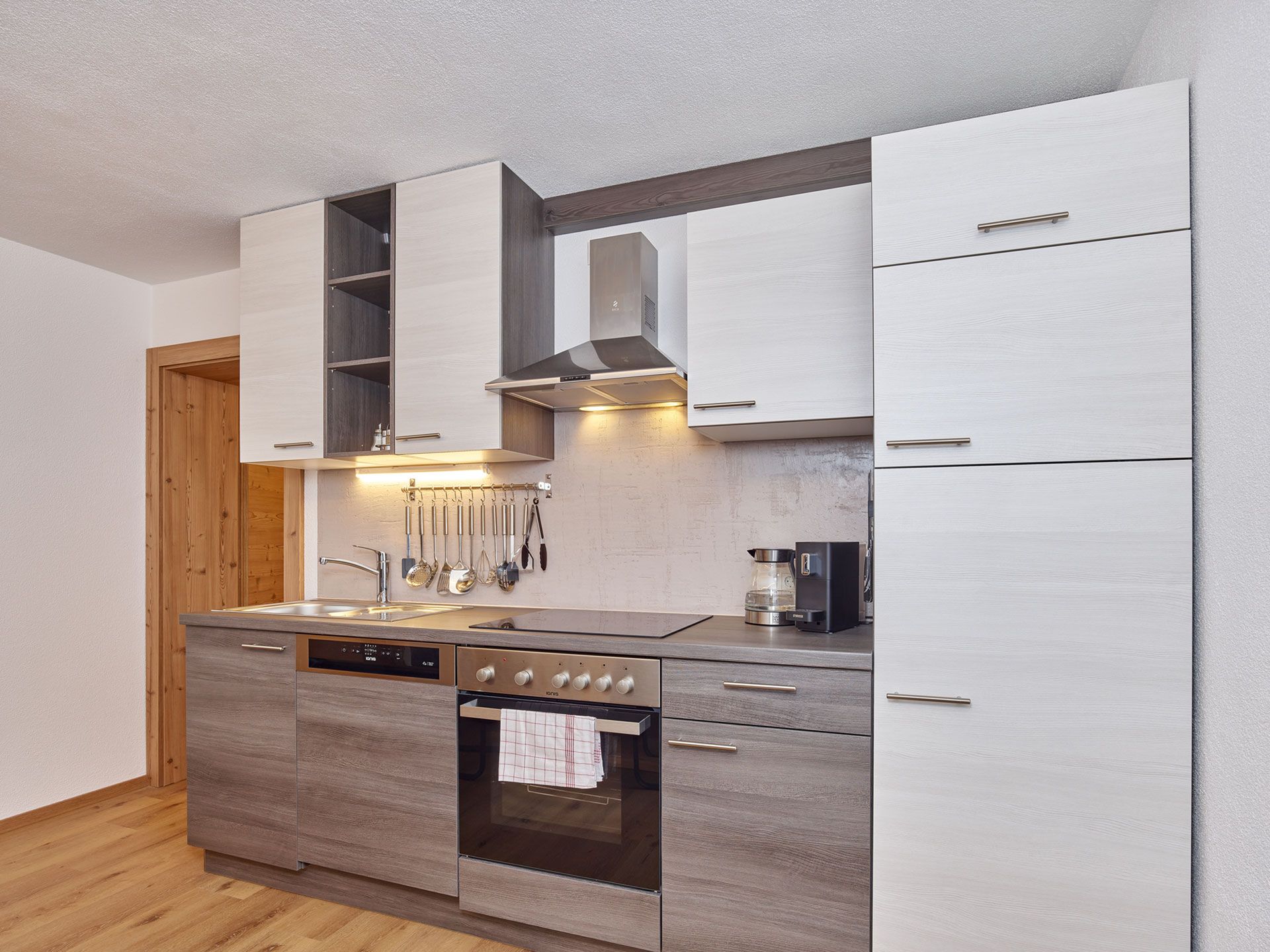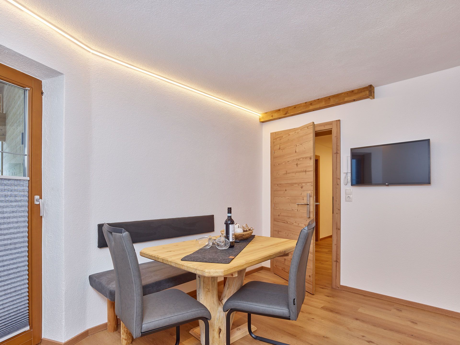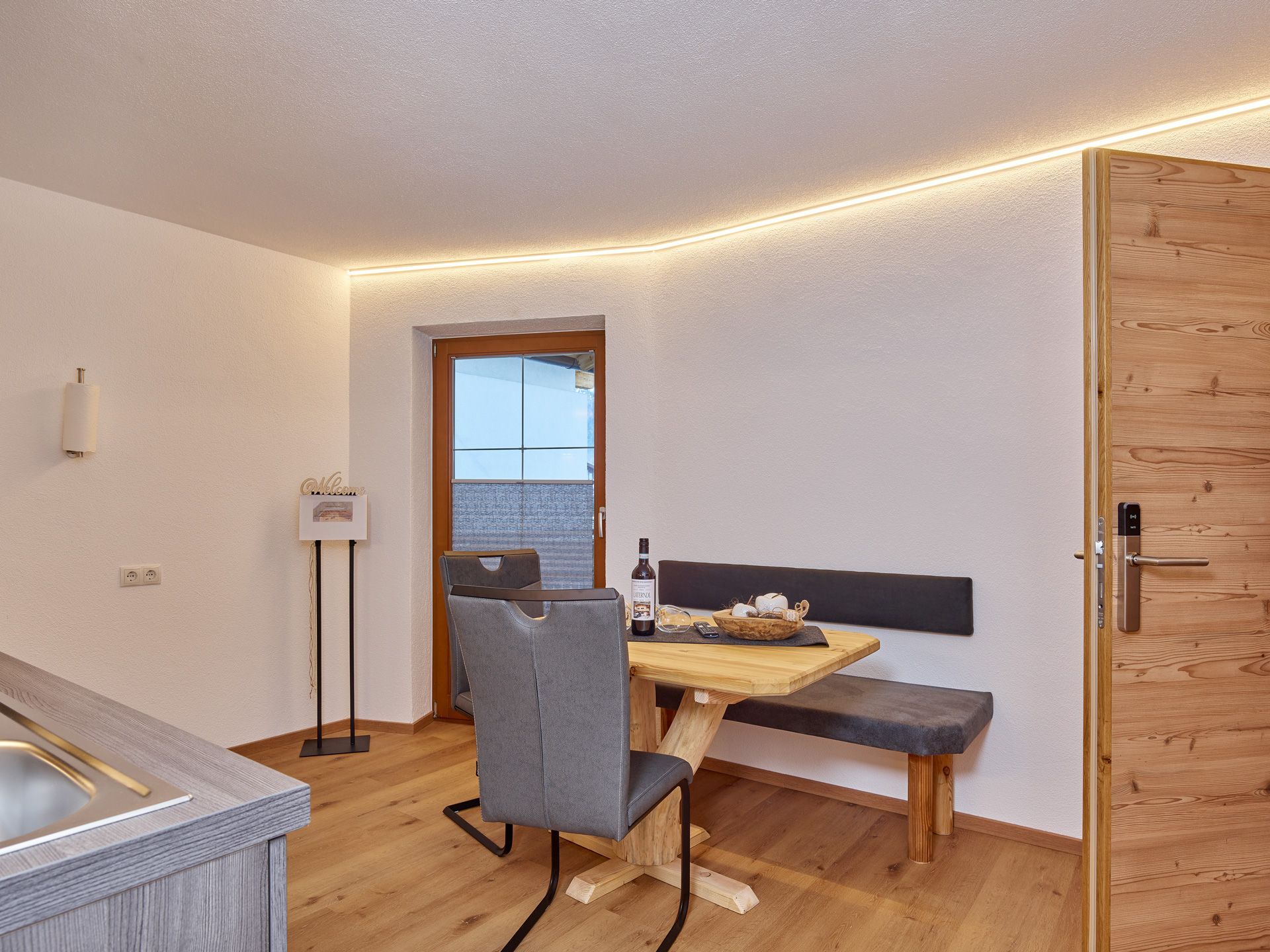 Im geschmackvoll eingerichteten Wohnbereich befindet sich eine vollausgestattete Küche (Herd mit Ceranfeld, Backrohr, Kaffeemaschine, Wasserkocher, Geschirrspülmaschine, Kühlschrank mit Gefrierfach) sowie eine gemütliche Sitzbank mit Tisch und Stühlen.
